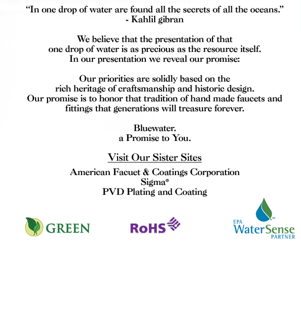 Home - About Our Company -Contact Us Bluewater Classics - Regions Collection - Regions Foundry - Ribbon Series - Modern - Europa - Specialty Kitchen Bar & Bath Thermostatic Valves & Shut Offs - Personal Shower Components - Fire Clay Farm Sinks Installation Instructions - Specifications - Finishes
